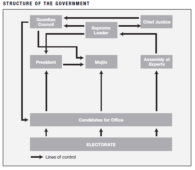 در اینجا می‌توانیم ساختار مختصر شده فرانسه، ایران و سپس چین را در زیر مقایسه کنیم. در این نمودار بسیاری از نهادهای انتصابی جمهوری اسلامی، مانند شورای مصلحت نظام، حذف شده‌اند.